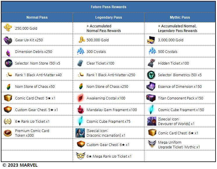 Um novo passe de temporada poderá ser obtido após a atualização, divididos em Normal, Lendário e Mítico, os prêmios estão na imagem abaixo: